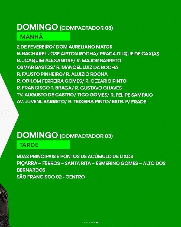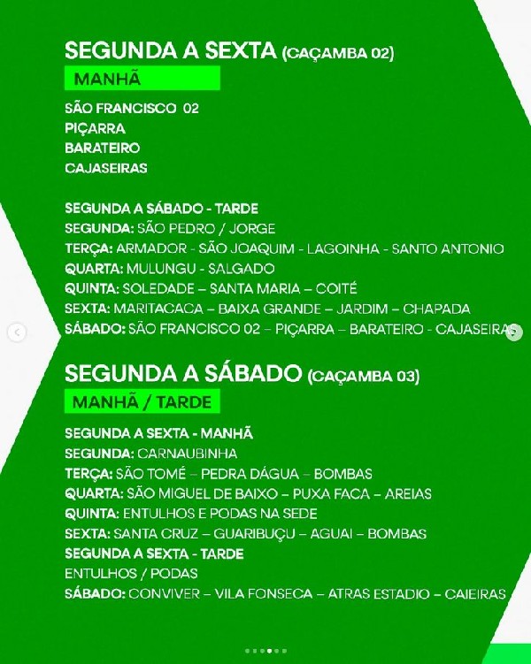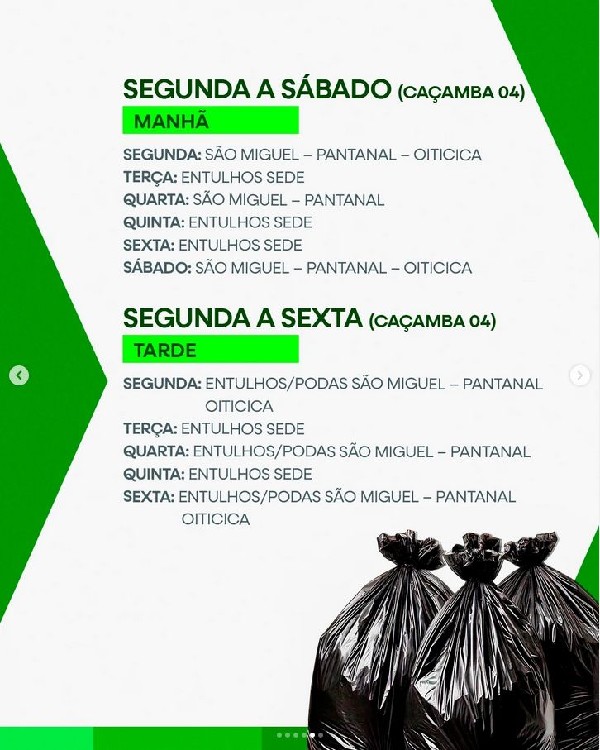 A Prefeitura, por meio da equipe responsável pela limpeza pública, disponibiliza o cronograma atualizado da coleta domiciliar, garantindo que a população possa se organizar com mais tranquilidade e contribuir para manter a cidade limpa e bem cuidada.