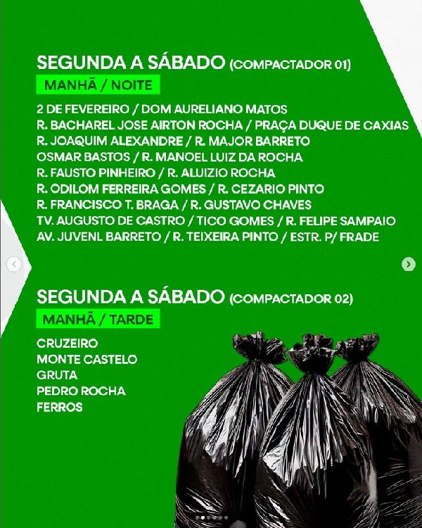 A administração municipal também orienta que o lixo seja colocado na calçada pouco antes do horário da coleta, evitando que animais tenham contato com as sacolas e causem sujeira nas vias públicas.