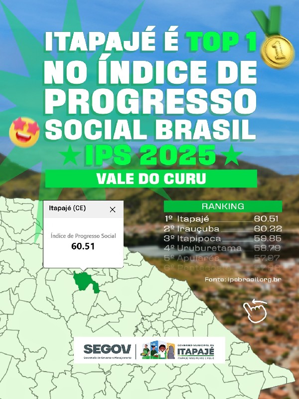 O município de Itapajé alcançou 60,51 pontos no Índice de Progresso Social (IPS), registrando crescimento em relação a 2024, quando obteve 59,06 pontos. O resultado evidencia uma evolução consistente dos indicadores sociais e reforça o impacto positivo das políticas públicas implementadas pela gestão municipal, voltadas à promoção da qualidade de vida da população.